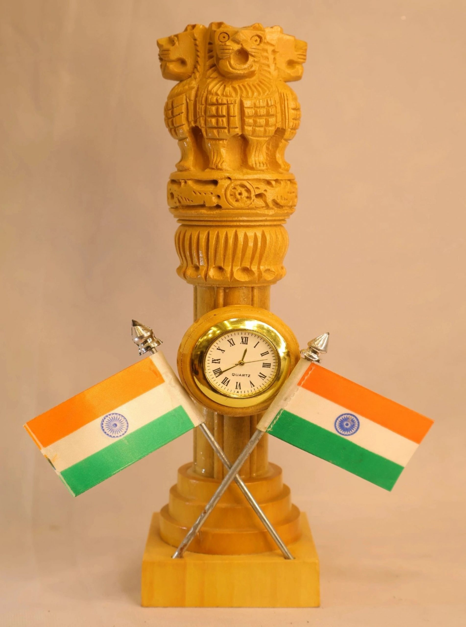 This handcrafted Ashok Stambh desk clock unites symbolism, craftsmanship and utility in one elegant tabletop piece. The vertical Ashok Stambh replica reproduces columnar fluting and a stylized lion capital, while the central round clock (Roman dial) offers a refined timepiece inset; two crossed Indian tri-colour flags complete the balanced composition. Mounted on a stepped wooden base with a smooth honey finish, the showpiece is lightweight, stable and polished for executive desks, reception counters, law chambers and institutional gifting. It functions as both a useful desk accessory and a dignified emblem of national pride — ideal for Republic/Independence Day presents, corporate giveaways, or institutional awards