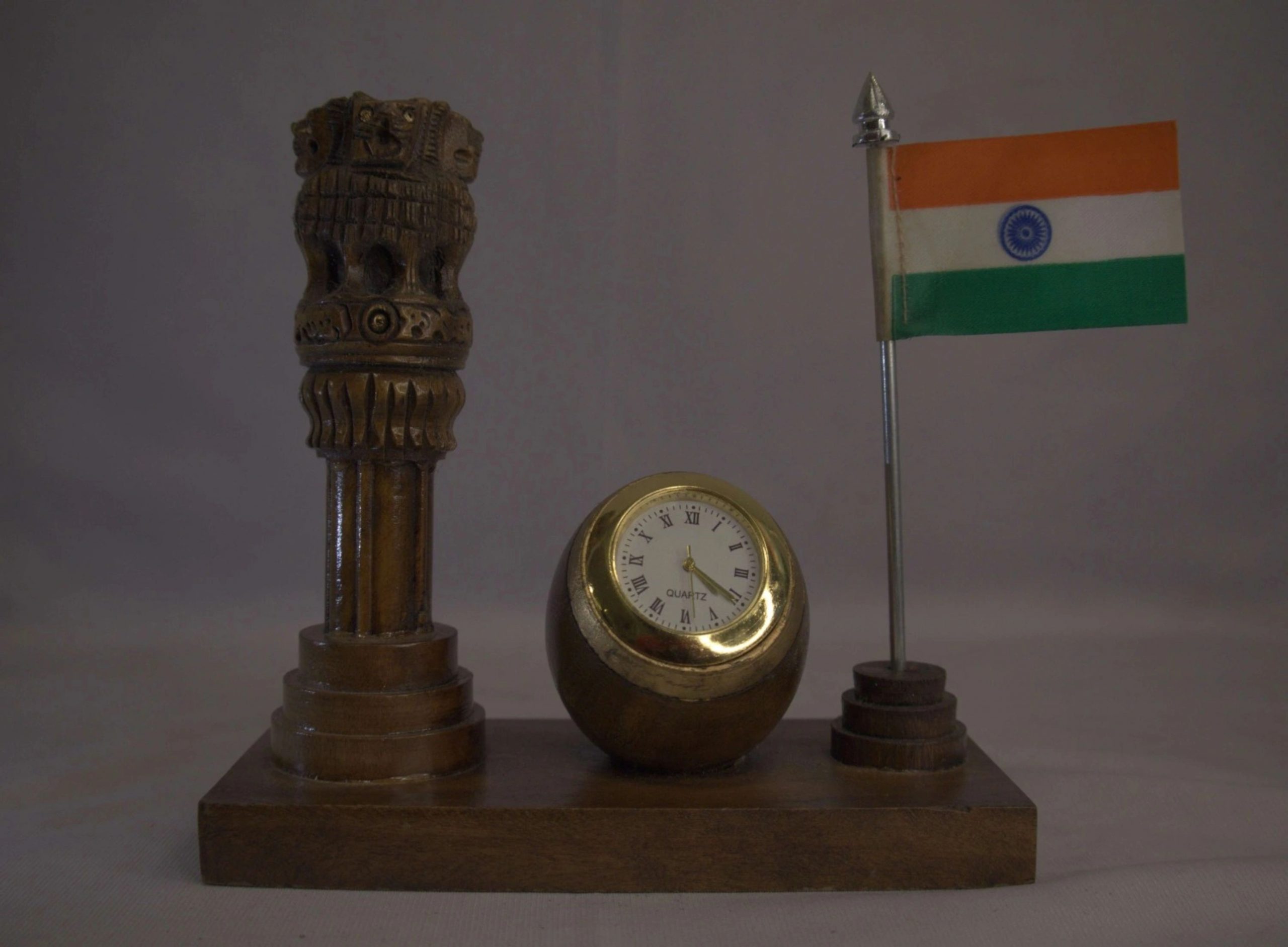 This handcrafted wooden desk showpiece artfully combines national symbolism and practical function. The left-mounted Ashoka Pillar replica reproduces columnar detail and a stylized lion capital, while the central spherical clock provides a refined timepiece inset with Roman numerals, and the right-mounted Indian tri-colour flag completes the balanced composition. Finished in warm wood tones and a smooth polish, the piece is lightweight yet stable for executive desks, reception areas, study tables and shelves. It makes a distinguished corporate gift, ceremonial memento, or institutional keepsake for government offices, law chambers and schools.